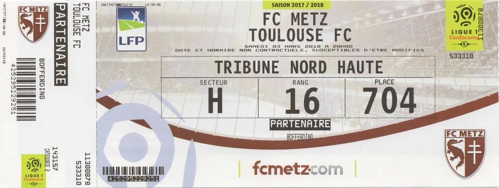 L1-J28 - 03 mars 2018 20h00 : FC Metz - Toulouse FC : 1-1 (11 287 spectateurs)